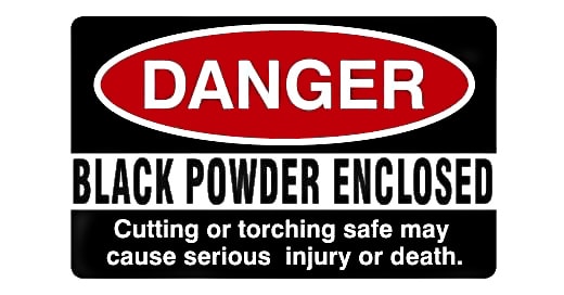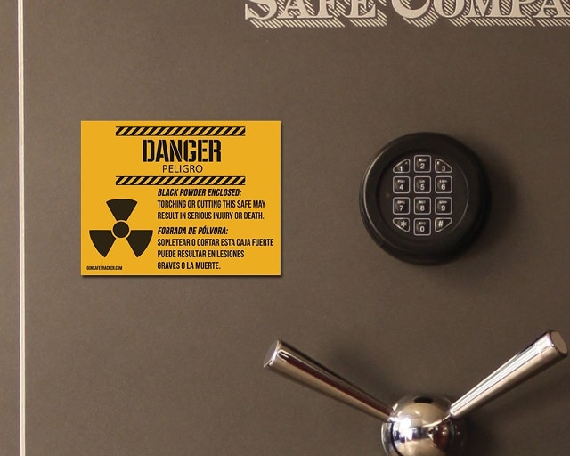 Такую табличку можно сделать самому в домашних условиях, написав что-то вроде: "ВНИМАНИЕ! Внутри хранятся порохи и боеприпасы. Вскрытие сейфа с помощью электромеханического инструмента и газосварочного оборудования опасно для здоровья и жизни!"