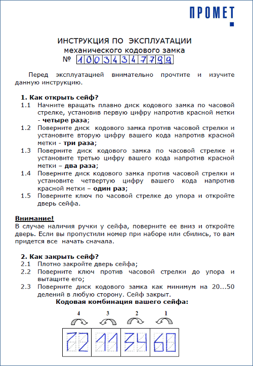 Такие замки либо предусматривают возможность смены кода, либо нет. Во втором случае кодовая комбинация устанавливается на заводе и больше никогда не меняется. Узнать заводской код такого замка можно по серийному номеру, обратившись в сервисную службу или непосредственно на завод. Серийный номер и кодовая комбинация указываются в паспорте или инструкции по эксплуатации сейфа. Вот пример, как это выглядит.
