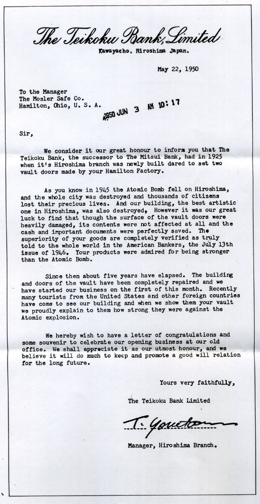 "Сэр, считаем честью сообщить Вам, что банк Тейкоку, наследник Мицуи банка, еще в 1925 году оборудовал два хранилища дверями, изготовленными на вашем заводе в Гамильтоне. Как вы знаете, в 1945 году на Хиросиму была сброшена атомная бомба - весь город был разрушен, погибли тысячи граждан. Было уничтожено и наше здание, считавшееся одним из лучших в городе. Хотя, снаружи двери и были сильно повреждены, к счастью, содержимое банковских хранилищ не пострадало - денежные средства и важные документы оказались в целости и сохранности. Превосходство вашей продукции полностью подтверждено, как справедливо написал "American Banker" в своем выпуске от 13 июля 1946 г. То что сильнее атомной бомбы достойно восхищения.