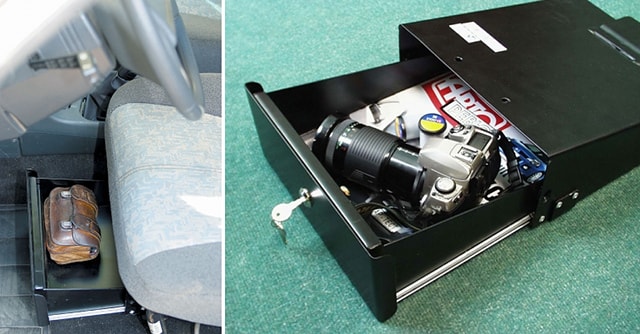 Для хранения ценных вещей в машине специалисты из компании "ТехноМастер" (Тольятти, Россия) разработали мини-сейф, встраиваемый под водительское сиденье. Цена вопроса - 1700 руб. "Ящик для документов" - так именуется в рекламных материалах автомобильный сейф клиновидной формы, окрашенный в черный цвет. В то же время, внутренние размеры (260х330х100 мм) позволяют разместить не только документы, но и магнитолу, мобильный телефон и пр.