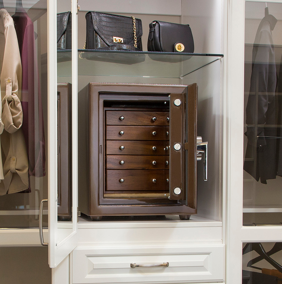 10) Гардеробная с миниатюрным сейфом под ювелирные украшения. Здесь дизайнеры использовали взломостойкий сейф Topaz (не путать с южнокорейской маркой огнестойких сейфов, популярных в России до 2015) американской компании Casoro Jewelry Safes. Эта серия имеет редкое сочетание компактных размеров, небольшого веса и высоких защитных характеристик. Широкие возможности кастомизации внутреннего устройства сейфа, цветового исполнения и отделки были эффектно использованы при проектировании дизайна интерьера этой гардеробной.