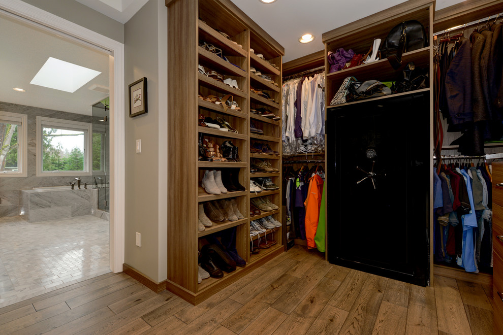 6) Мужская гардеробная в классическом стиле с открытыми шкафами. Техасские дизайнеры из Остина смогли филигранно вписать оружейный сейф Liberty серии Lincoln в интерьер гардеробной комнаты. Решение для техасских рейнджеров.