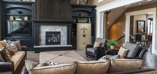 В плане проходимости гостиную также нельзя назвать лучшим местом для установки сейфа — здесь собираются все члены семьи и вместе проводят время, здесь принимают гостей. Эта комната всегда находится в центре внимания. Поэтому если уж решили поставить здесь сейф, то хорошо продумайте как он будет «дружить» с дизайном интерьера. Декоративная функция в данном случае играет важную роль.Американцы любят ставить сейф у камина. Вот несколько вариантов интерьеров гостиных, обустроенных с использованием с использованием сейфов от LibertySafe: