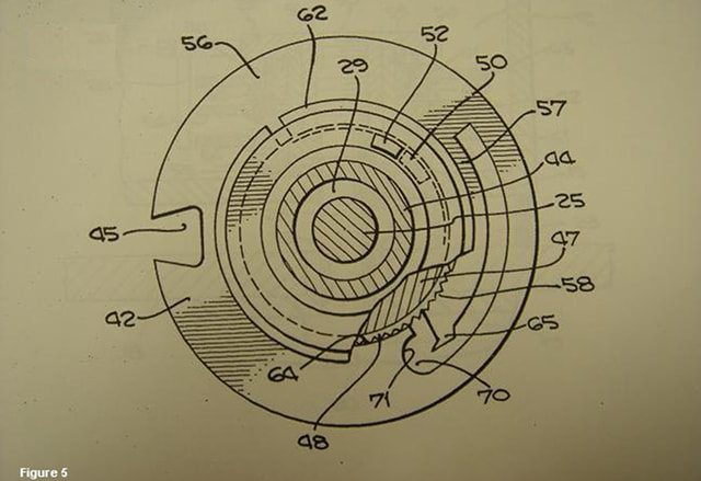 Первое серьёзное изобретение в области сейфовых замков было связано с пакетом дисков кодового механического замка. Новая конструкция стала революционной по причине своей простоты и надёжности. Механизм (рис.5) состоит всего из трех частей: пружинного стопорного кольца, внутреннего и внешнего дисков. И хотя патент был зарегистрирован еще в 1979 году, данное изобретение до сих пор используется в кодовых механических замках LaGard.