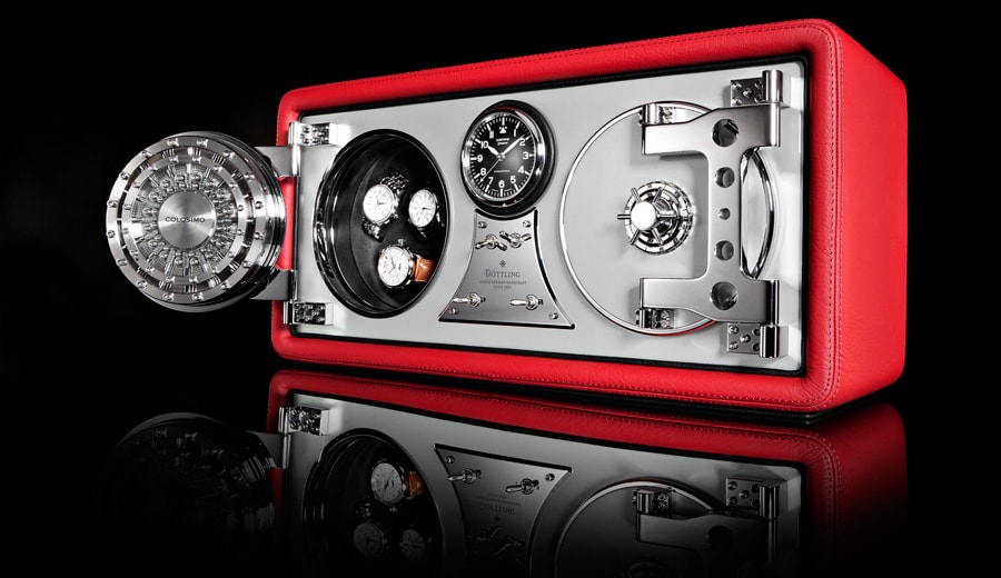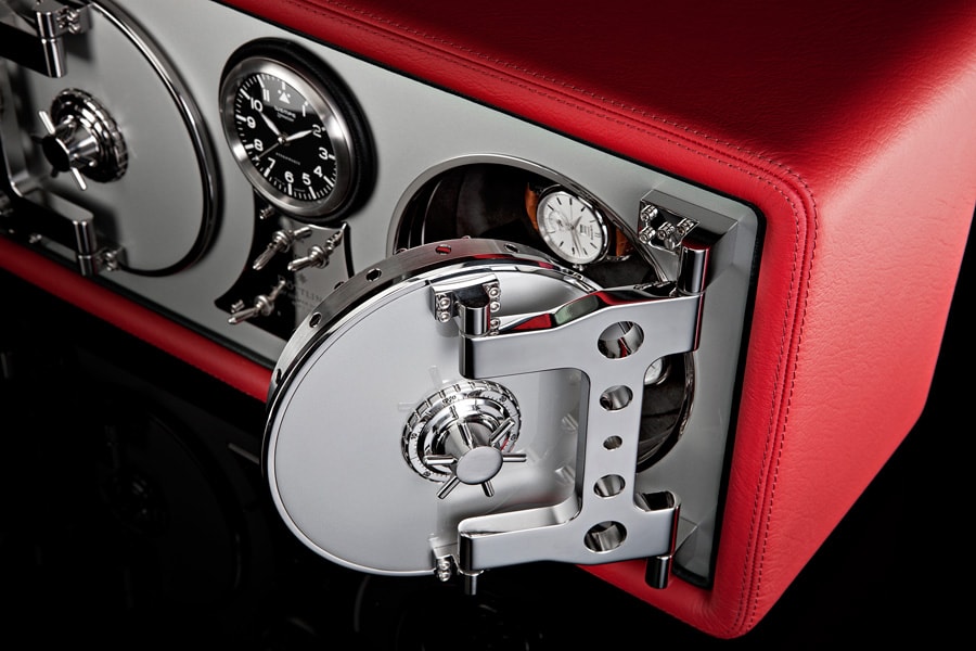 Источником вдохновения для дизайнеров Döttling стал Mercedes-Benz 300 SL Gullwing 1954 года выпуска. Первое, что бросается в глаза - встроенные часы Wempe Zeitmeister, расположенные в центре сейфа Colosimo Double Wing, как на приборной панели легендарного спорткара. Данью изысканности интерьера автомобильной легенды являются группа переключателей и корпус сейфа, обтянутый красной телячьей кожей.